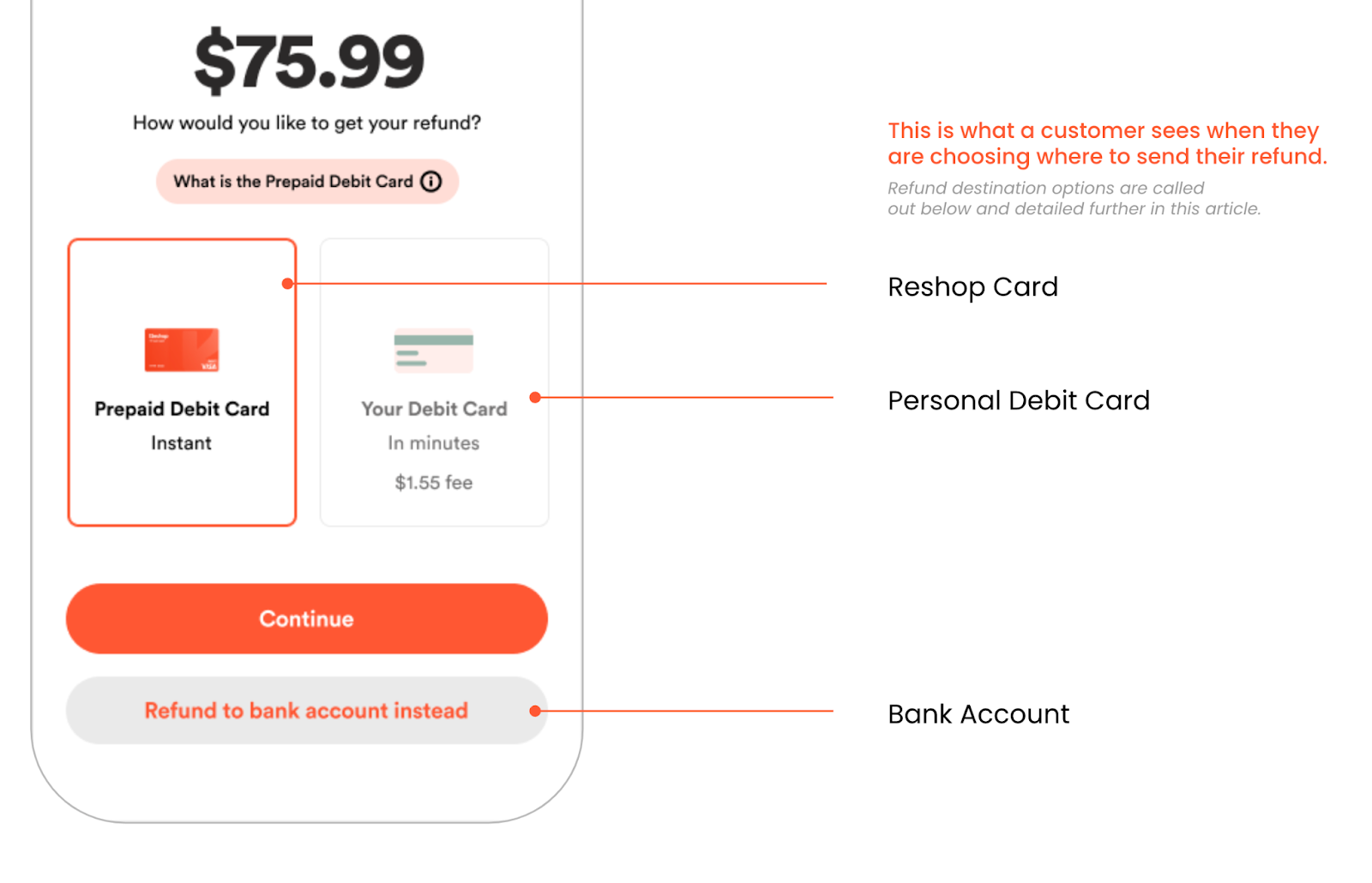 When your customer selects to get their refund through Reshop, they have the flexibility to choose how they receive their funds: either loaded onto a Reshop Card, sent to a personal debit card or deposited directly into a bank account.